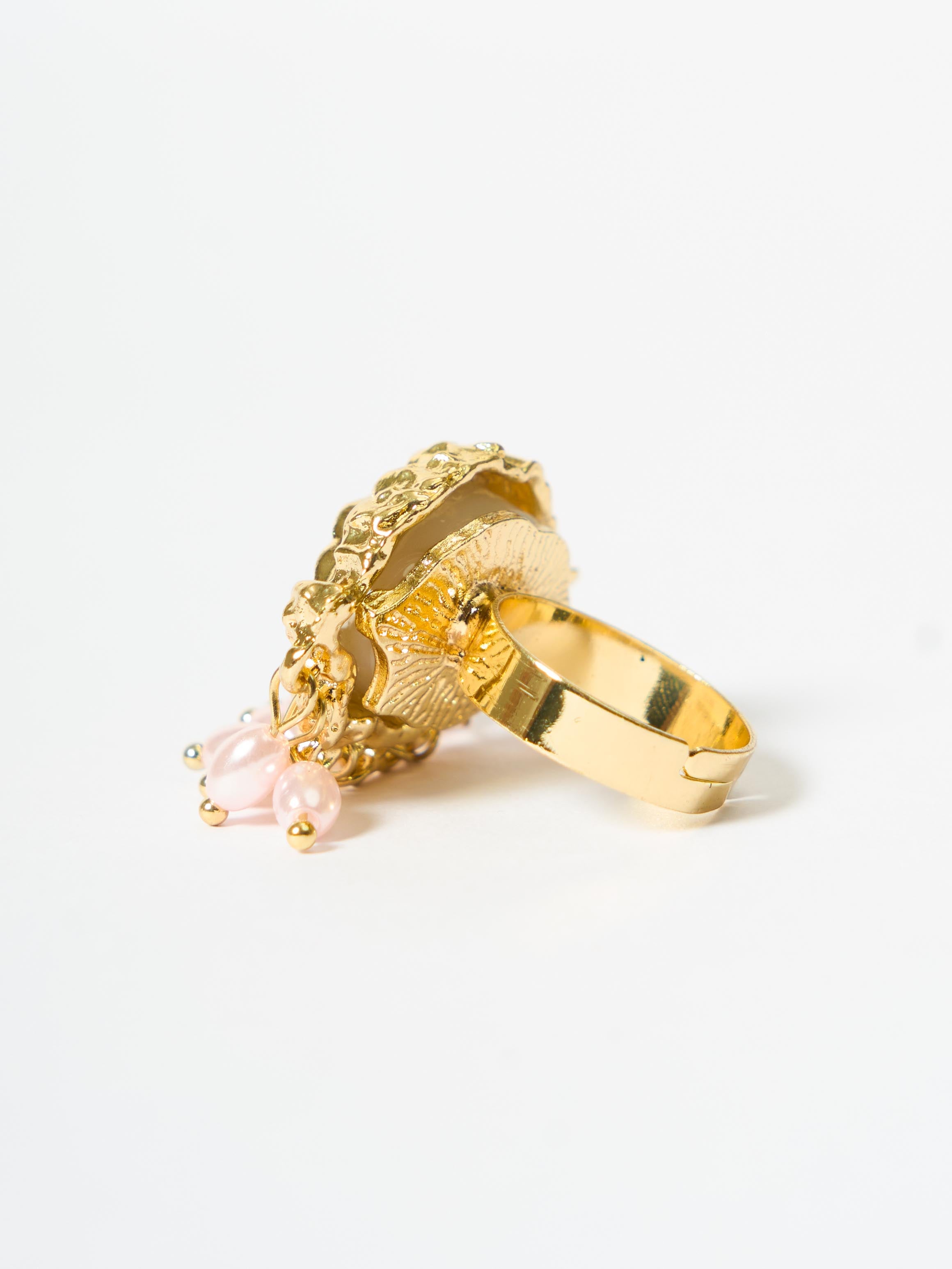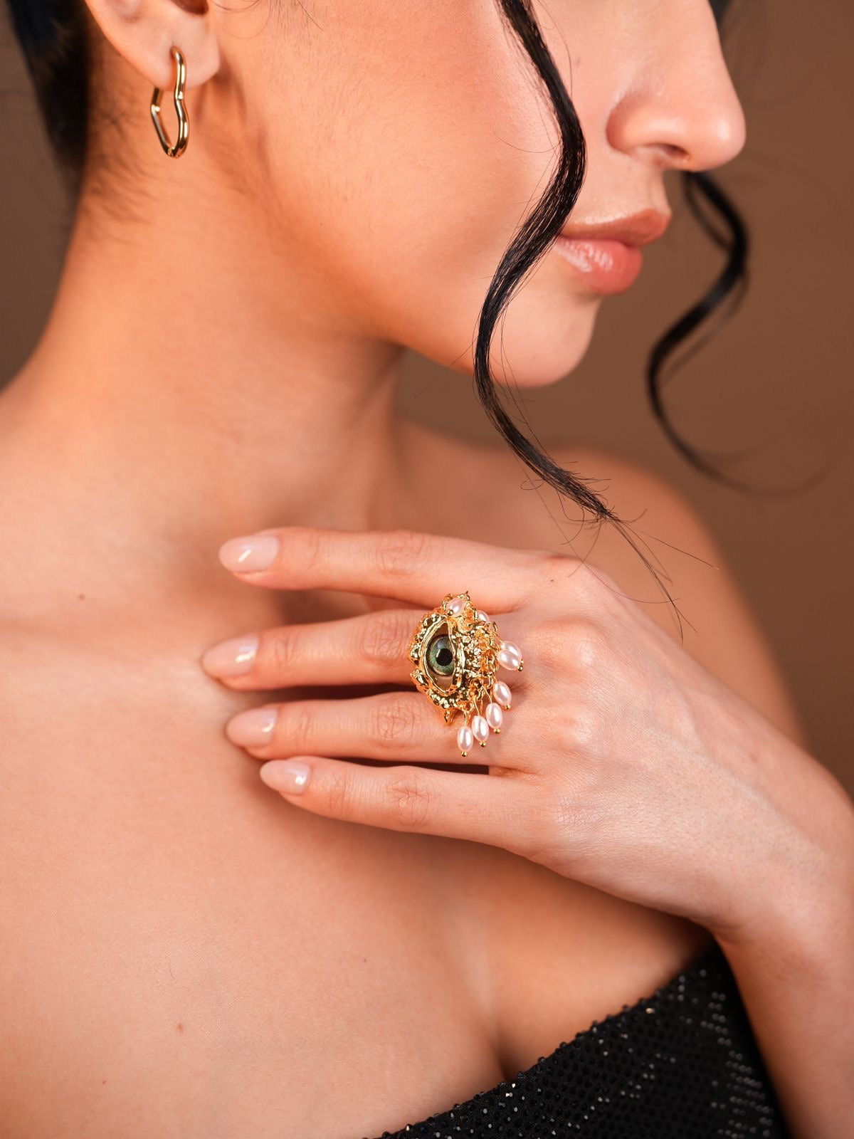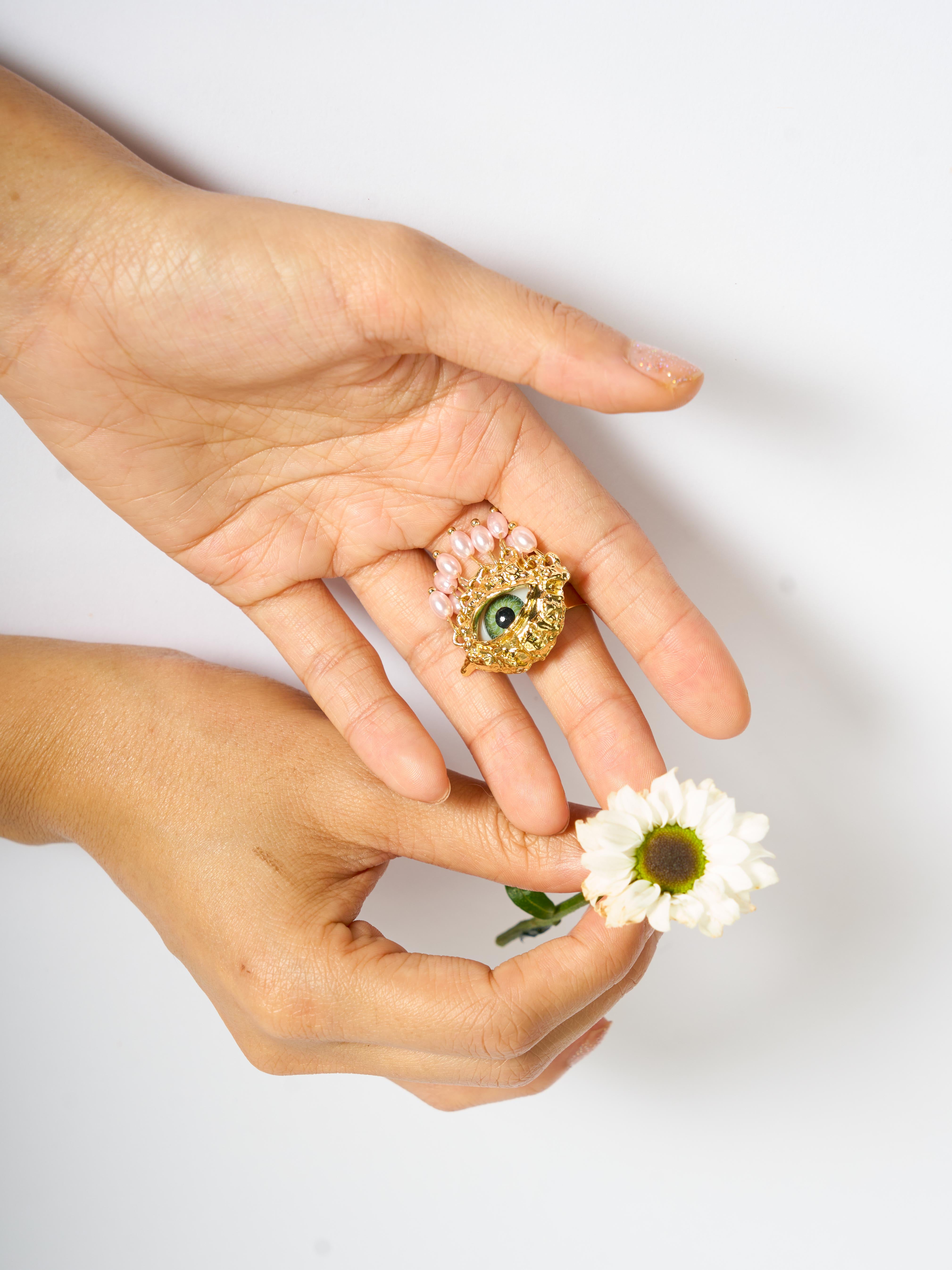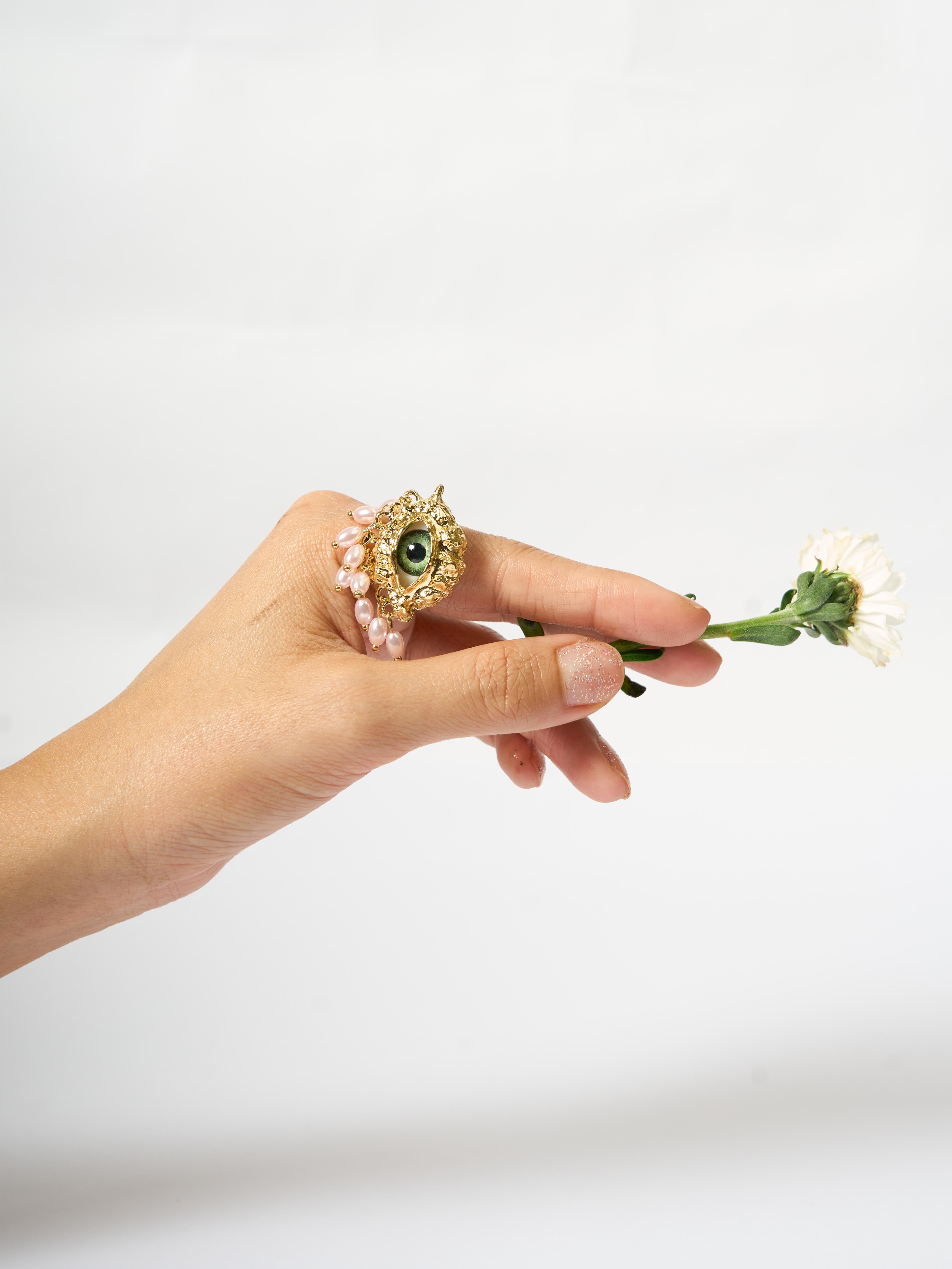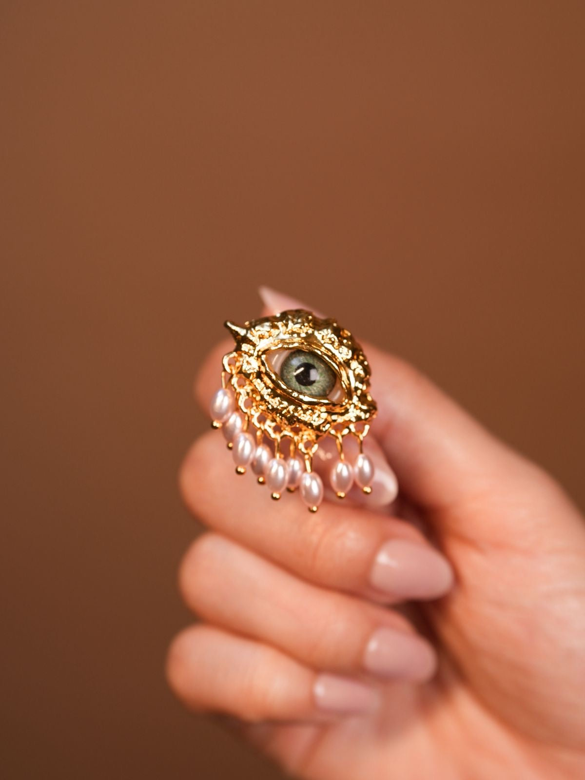 The Eye of Desire Ring is designed with a striking sculpted eye at its center. This statement piece sits on a textured gold base and is finished with delicate pearl drops that move beautifully with your hand. The result? A ring that blends celestial energy with high-fashion drama.