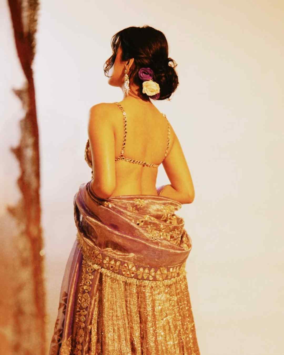 You can add fresh flowers, a passa, mathapatti, or a low veil without worrying about the bun collapsing or looking too small.